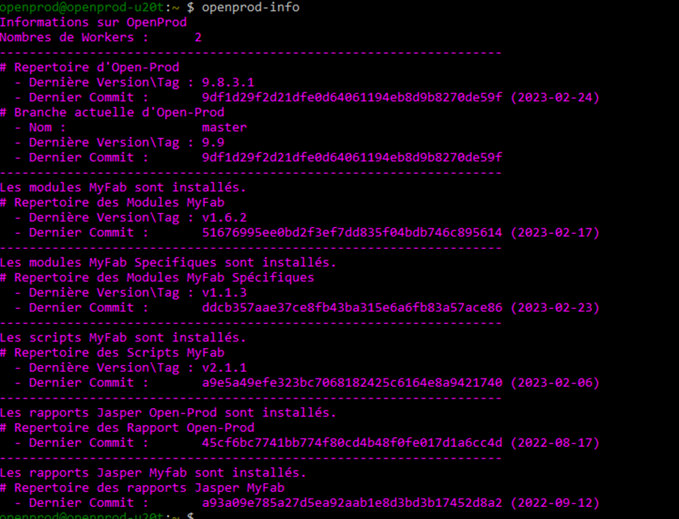 La commande permet d'afficher l’ensemble des informations de versions des Gits Open-Prod & Myfab.