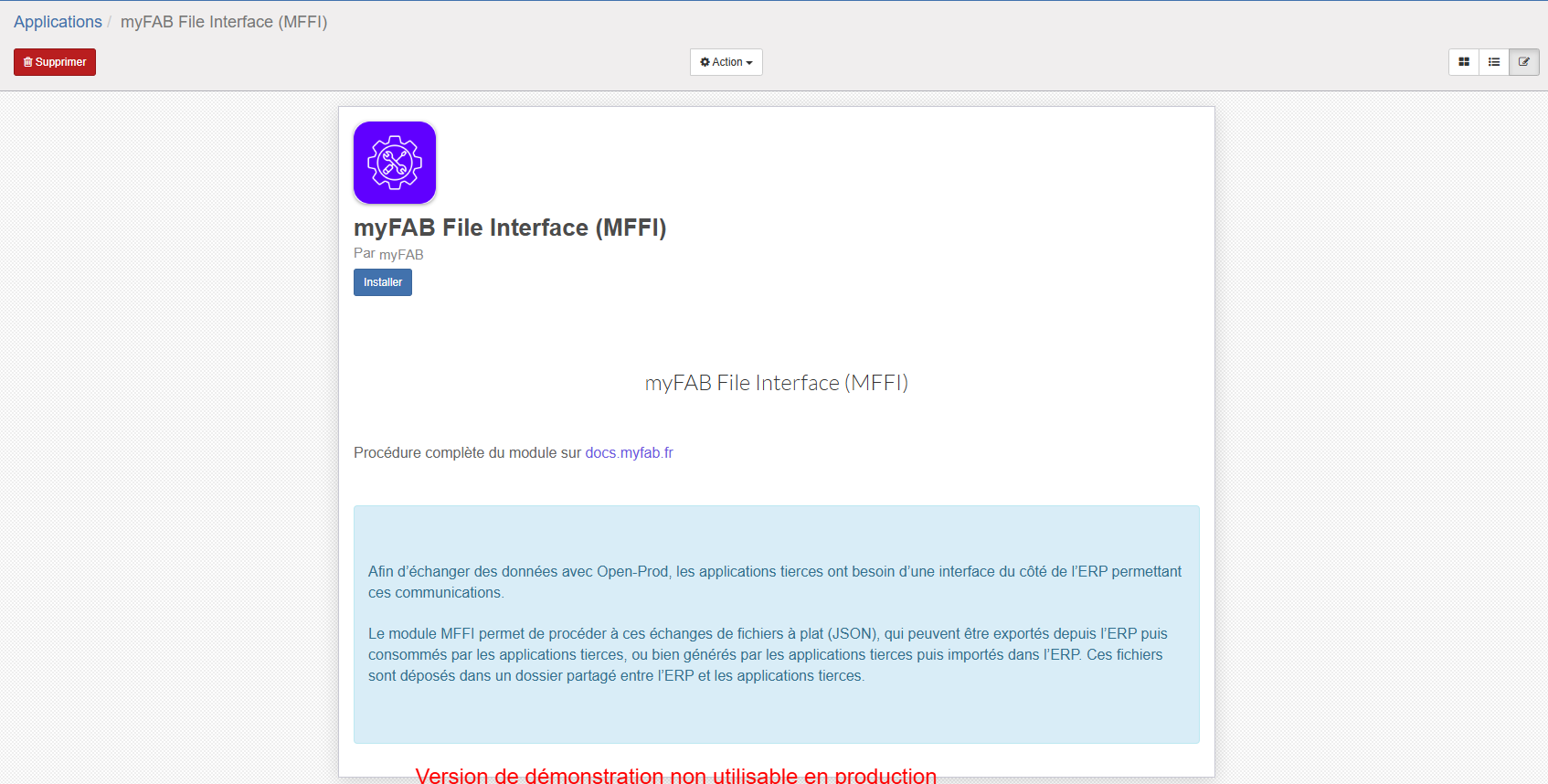 L'installation du module s'effectue depuis l'onglet Configuration > Application d'Open-Prod. Dans la barre de recherche, taper "MFFI". Le module myfab File Interface, ou mFI sera présent. Cliquer sur "Installer". A savoir que l'installation du module myFAB Fondation inclut également l'installation de myfab File Interface.