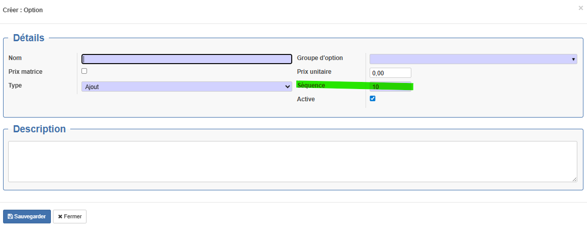 Ajout d'un champs "Séquence" sur les options pour de les ordonner (par exemple lors de l'impression des options)