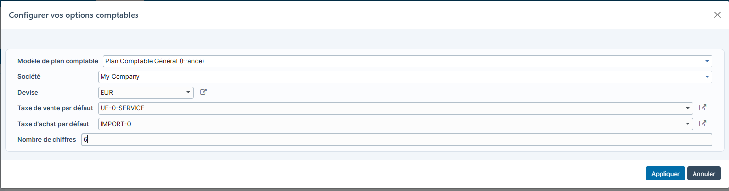 A mi parcours, la wizard suivante va vous demander de configurer vos options comptables (comme si vous installiez le module Comptabilité directement) :