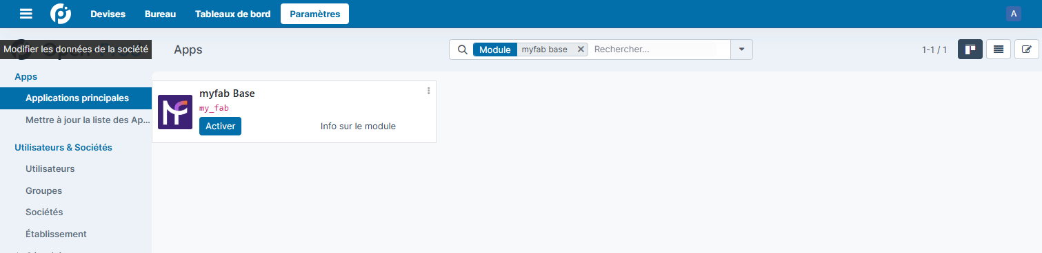 L'installation du module s'effectue depuis l'onglet Configuration > Application d'Open-Prod. Dans la barre de recherche, taper "myfab". Le module myFAB Fondation sera présent si les sources myFAB bien été déployées. Cliquer sur "Installer" puis suivre les différentes étapes du déploiement directement dans la page Open-Prod.