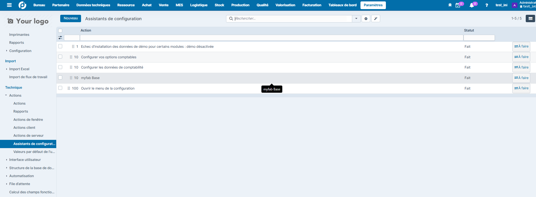 Le wizard d'initialisation se déclenche automatiquement lors de la première installation du module. Il est possible de le relancer manuellement si par exemple vous avez oublié de cocher les cases. Pour cela allez dans paramètres>Technique>Actions>Assistant de configuration