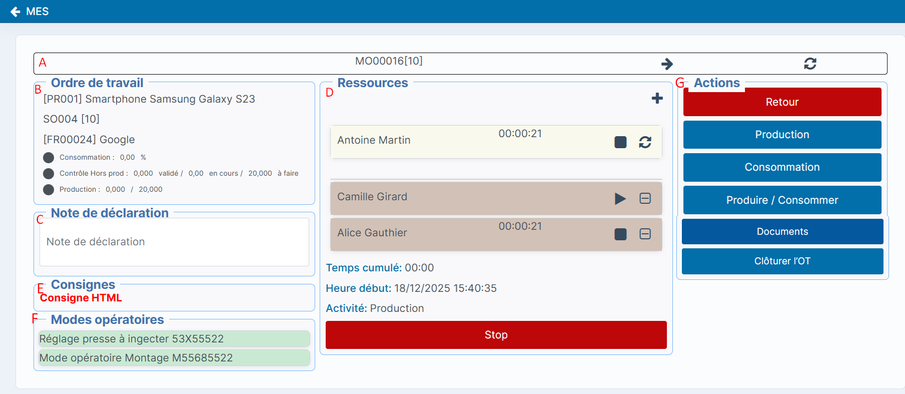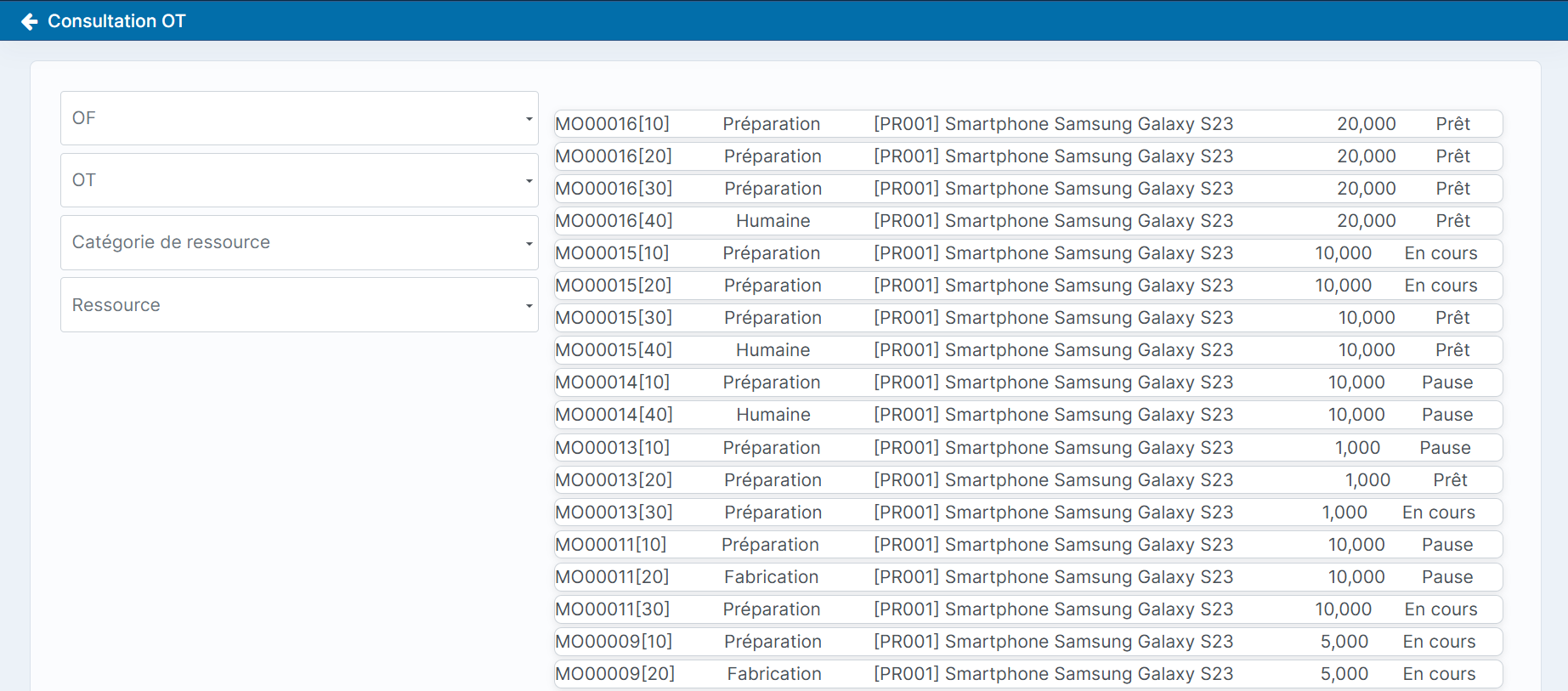 Seul les OT à l'état Prêt, En cours, Pause peuvent être trouvés à partir de cet écran.